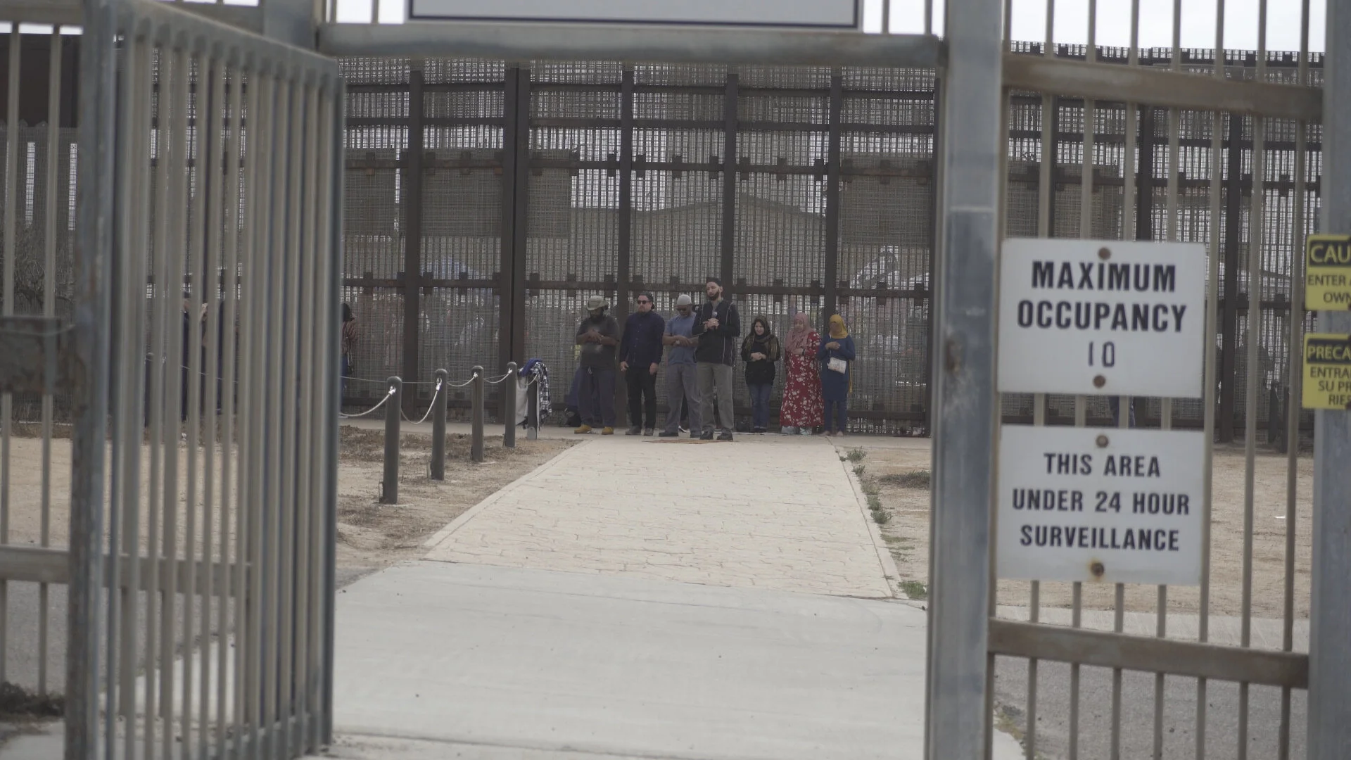 Imam Omar Sulieman leads the Border Mosque community on the US & Mexican side of the border fence in the mid-day prayer. Imam Omar is leading a small group of Muslims in this photo on the US side of the border, within the secondary border of Friendship Park. You can see through the fence more than one hundred Muslims following in prayer. This still is taken from the feature-length documentary, Pray Beyond Borders. Footage courtesy of Diego Lynch