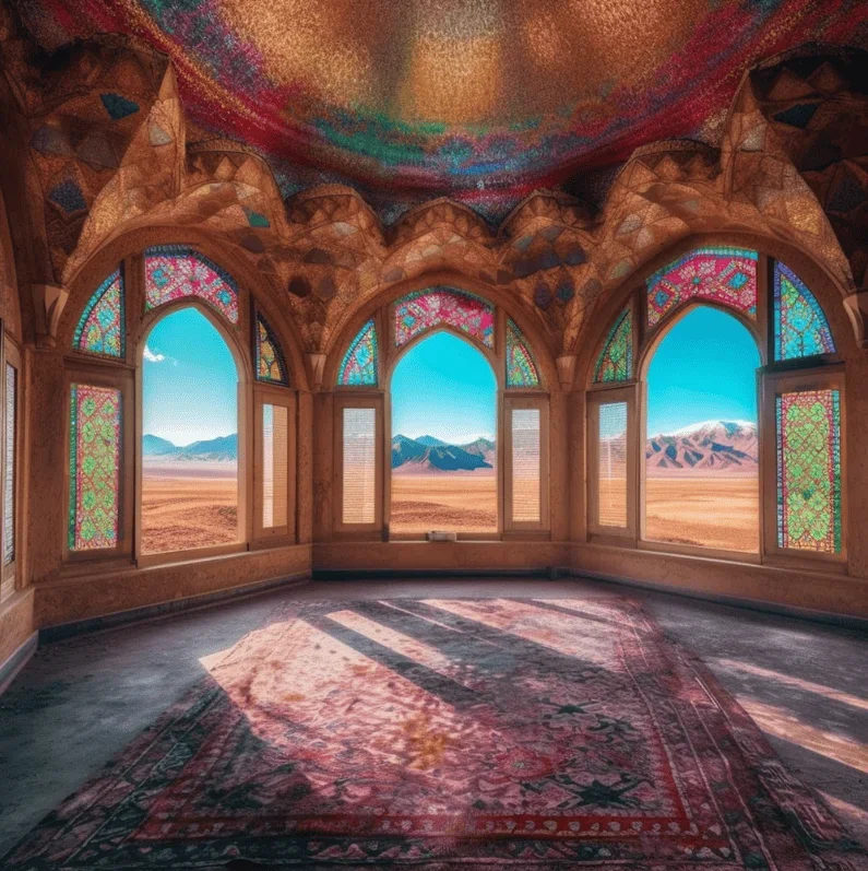 Mosque and retreat center in the style of Isfahan on the plains of Colorado looking out onto the Rocky Mountains, Turtle Island - Imagined in Midjourney