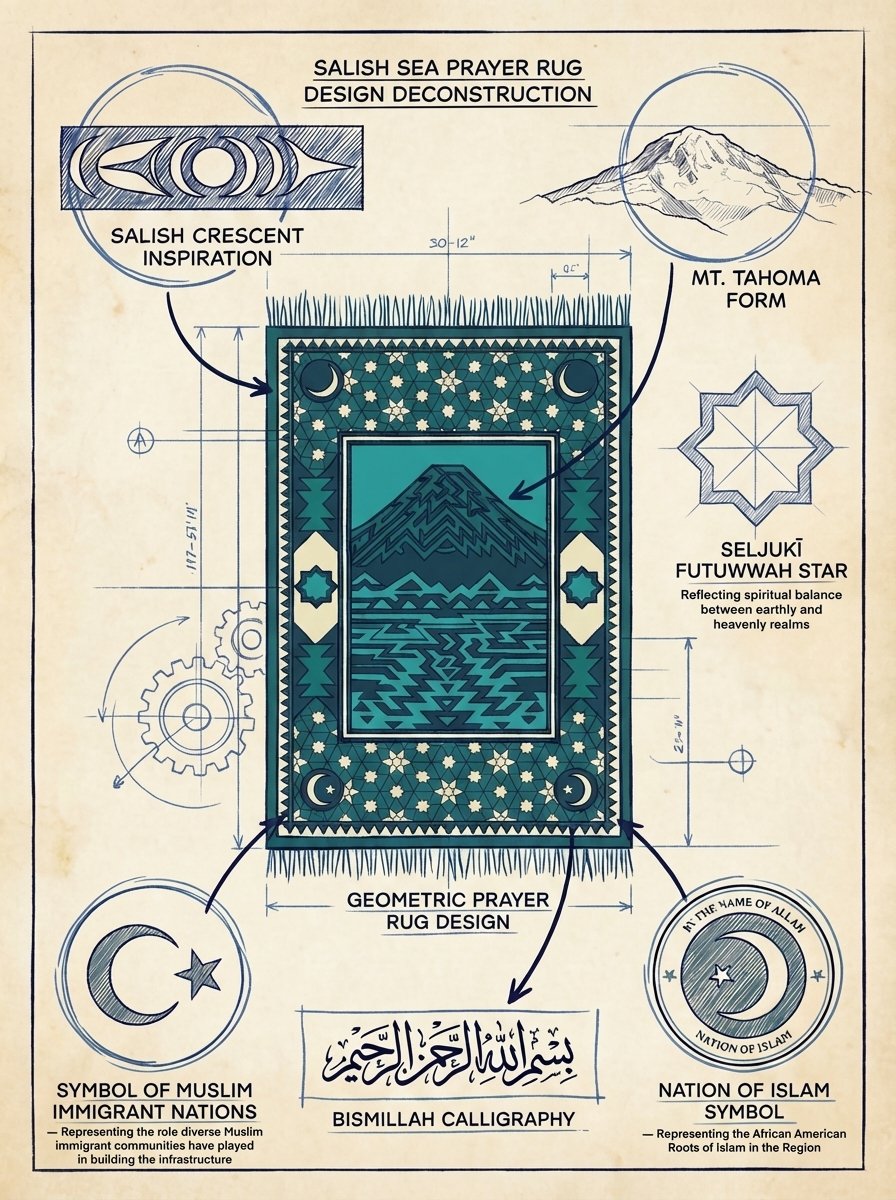 The design elements of this rug are rooted in the sacredness of place and time in showing the early hours of fajr (dawn) a time of prayer and reflection that we see in the light color of the dawn emerging on the horizon. Tahoma (Mt. Rainier) is at the center of this design what the Puyallup and Nisqually tribes call təqʷuʔməʔ (pronounced roughly "Taquoma") in the Lushootseed language meaning "the mother of all waters." The colors on the rug are reflective of the water of the Salish Sea that surrounds us, the old growth forests that give this place so much life, and the land we walk on.